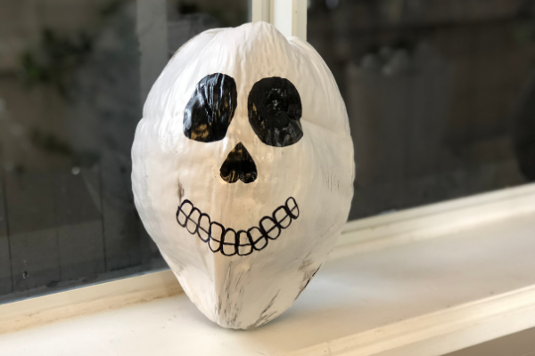 Primero dibuja con un lápiz los ojos y la boca de un fantasma en la corteza y los ojos, la nariz y la boca de un cráneo en el lado del coco que más te guste. Después, usando un marcador o pintura, rellena de color negro.