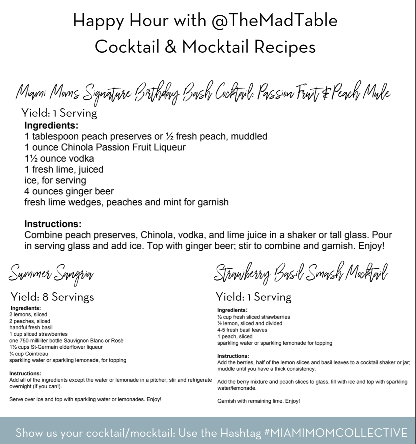 Enjoy your very own cocktails and mocktails at home using the recipes below! Tag @miamimomcollective and @themadtable so we can see your creations.