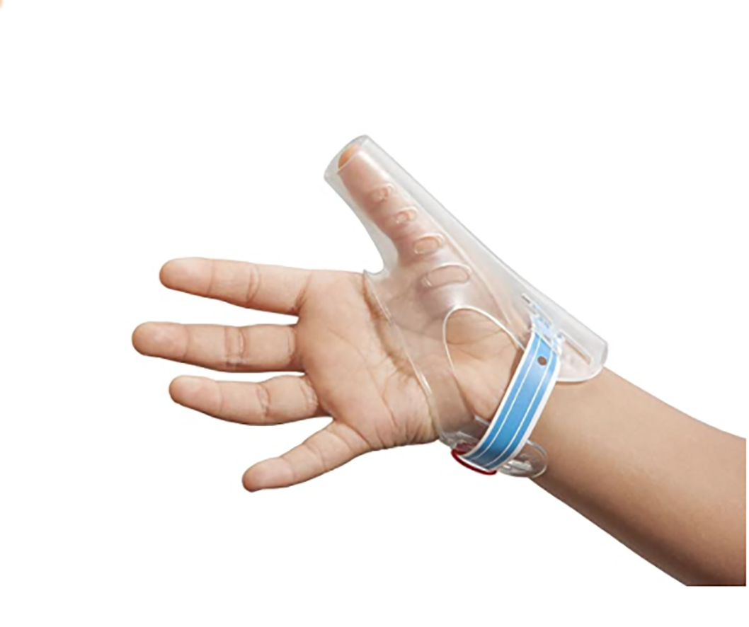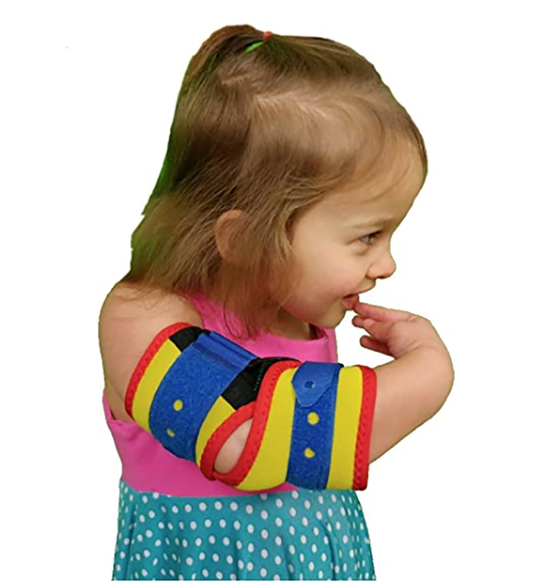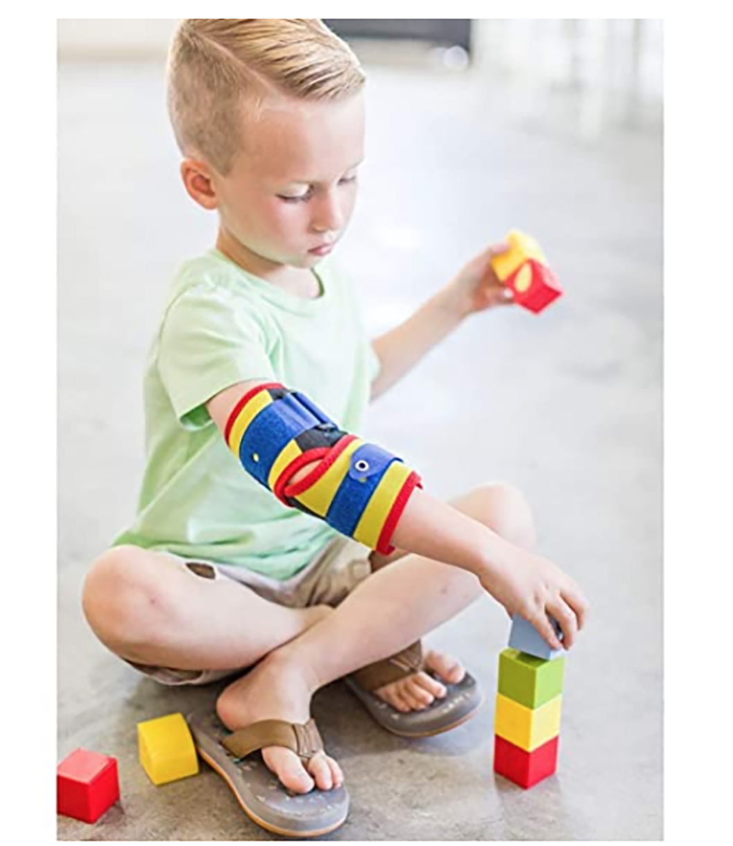 Then we tried the brace. It’s made of super strong velcro and a hard piece of plastic covered by soft fabric. It prevents them from bending their elbows enough to stop the finer or thumb from reaching the mouth.